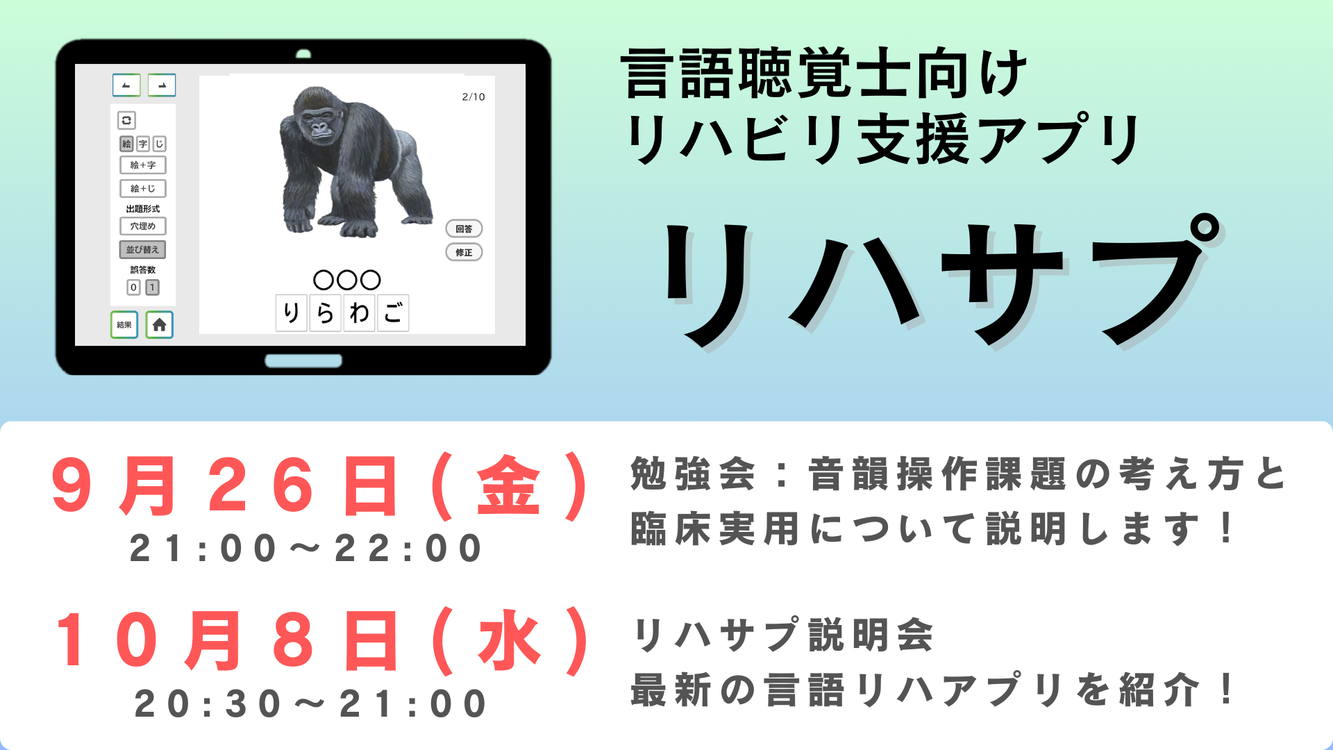 また、言語リハにおける課題の準備の効率化を提供する最新のアプリ「リハサプ」の説明会も実施します!