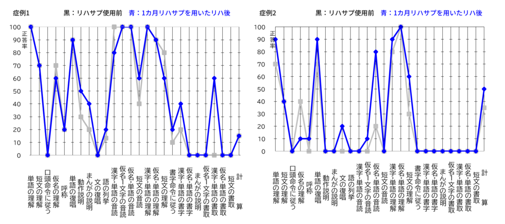 私たちは、リハサプを教材として使用した際の、訓練効果について2名についてSLTAで評価を行い、言語機能の向上が得られることを確認しました。症例1では主に、まんがの説明、動作説明、漢字・単語の書き取りが、症例2では仮名・単語の音読や短文の理解、文の復唱などの向上が見られました。